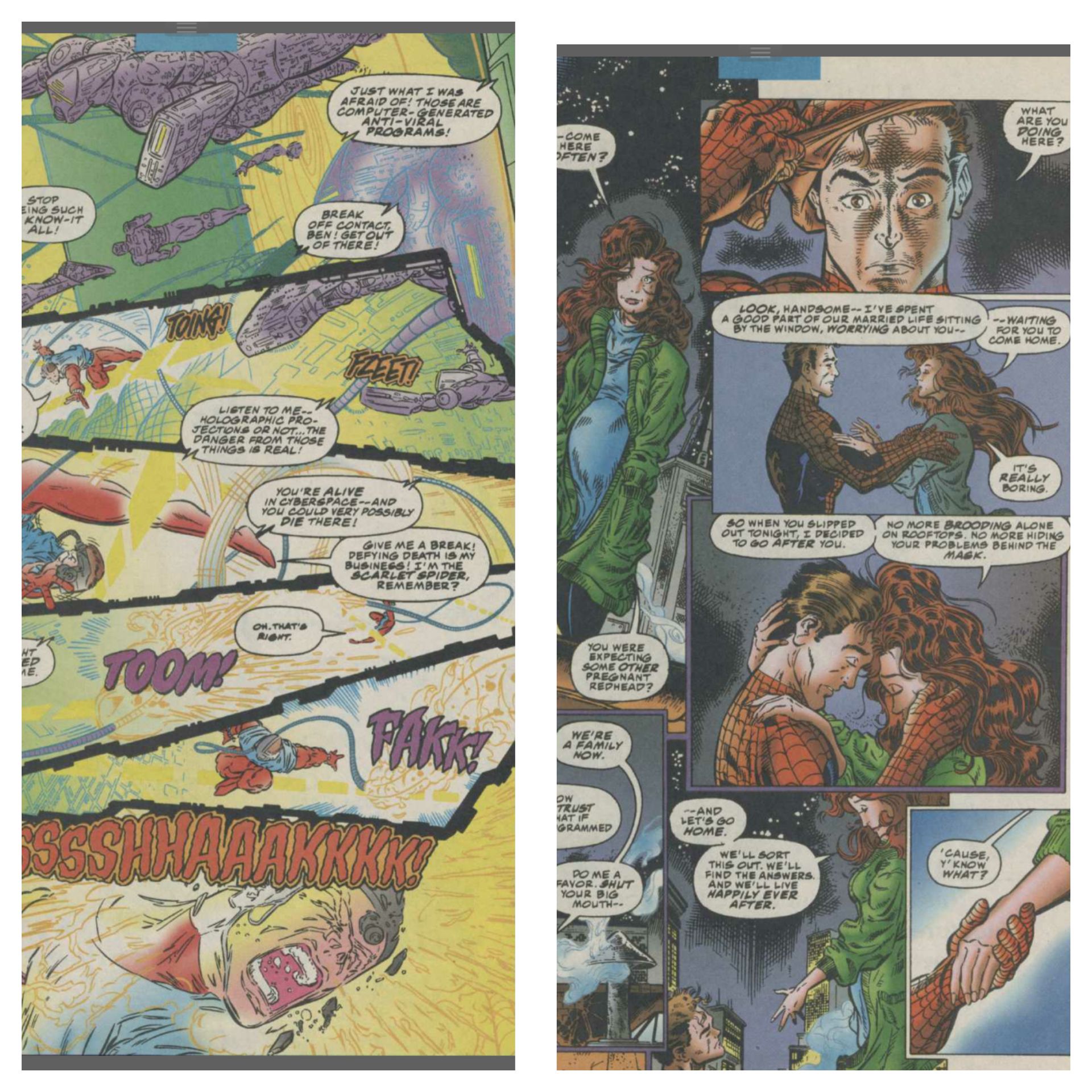 The whole cyberspace/VR thing takes me out of the story a little, it was the sci-fi buzz word of the time, like nanotechnology was afterwards and quantum related things did later. No one telling these stories had much of an idea what it was all about and honestly it just added some cool to the story. We also get a welcome end to the Jackal’s posthumous revenge and MJ starts showing that she’s pregnant. It’s all building towards something and as an issue it was a lot of fun.
