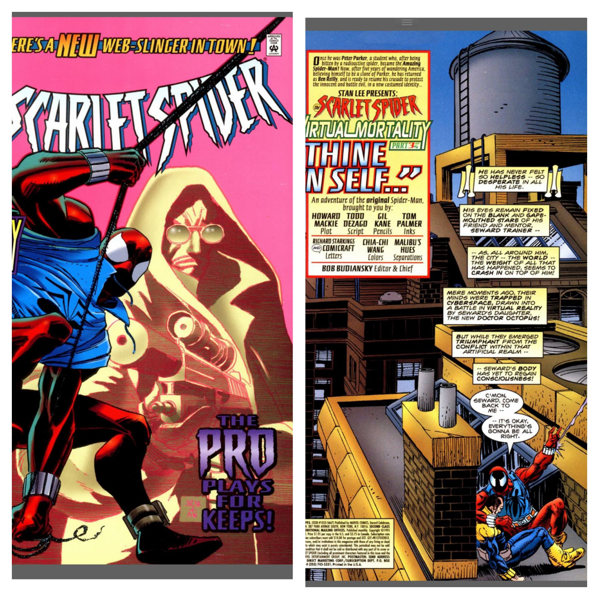 In cyberspace, Doctor Octopus II is meeting with her partner, the pair are planning at attack at Noir, using the Professional. As they conspire, they are observed by the Seward, whose mind is still trapped in cyberspace. At Noir, Ben (at his waitering job) spills a drink and is unceremoniously fired. He’s on his way out when he sees Seward’s face on the screen of an ATM. Near the club, two of Tso’s men encounter the Professional, who attaches magsats to their heads, informing him that they are controlled by a device he has and have the destructive power of a .44 slug. The pair walk into the club intent on killing Tso, to save their own lives. The each attempt to throw a grenade, but Ben hasn’t left yet and dives towards them, knocking the grenades away, allowing Tso to escape. The explosion creates enough of a diversion to allow Ben to change into his Scarlet Spider costume.