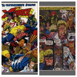 Plot: Surrounding the X-Men/X-Factor team (Havok, Wolverine, Wolfsbane, Polaris, Gambit, Strong Guy, Rogue and Multiple Man) and trying to look as mean as possible X-Force (Cannonballl, Feral, Boom Boom, Rictor, Sunspot, Siryn, Shatterstar and Warpath) stand their ground. Alex/Havok and Sam/Cannonball are trying to talk about things, without either giving ground, but Feral feels that an attack is imminent and goes pre-emptive causing ranks to break and a large melee breaks out. Although they start out strong, X-Force realise that they’re not going to win this and they pull out running.