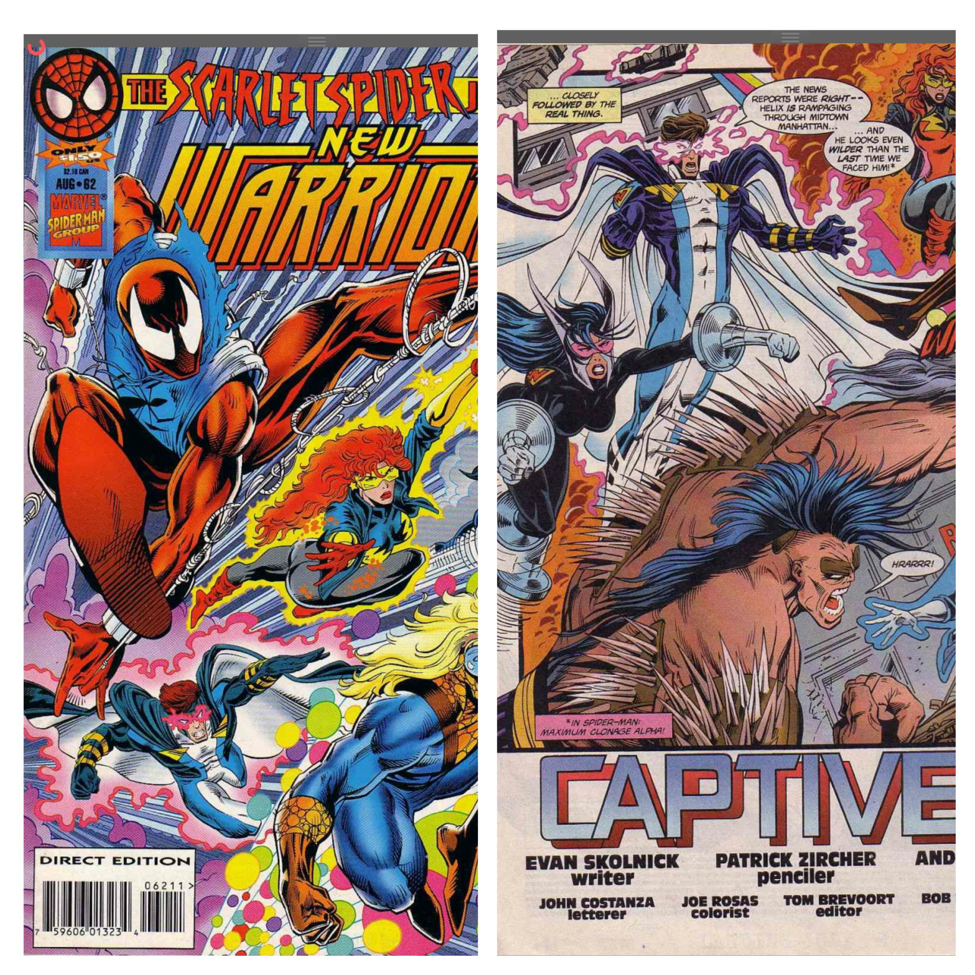 Plot: In the heart of midtown Manhattan, Helix is rampaging. Last seen in the Maximum Cloneage saga, which started here and now he’s out again and destroying things. Out to stop him are the New Warriors (Justice, Firestar, Speedball, Powerhouse and Turbo) who were involved in his last appearance as the only survivor of a viral attack caused by the Jackal. He appears to change with each attack and doesn’t seem to be either willing or able to communicate. Firestar is asked to take him out, but for the reasons that the comic doesn’t elaborate on (although I do remember this) is too hesitant and has to be saved by Turbo. Swinging nearby is Ben ‘Scarlet Spider’ Reilly, who has just come off the revelation that he was the original Spider-Man. He sees Helix and the Warriors and tries to help as he’s been expecting Helix to show up again.He webs up his quarry and gets ready to tranquilise him, when he expands his size and rips through the webbing..