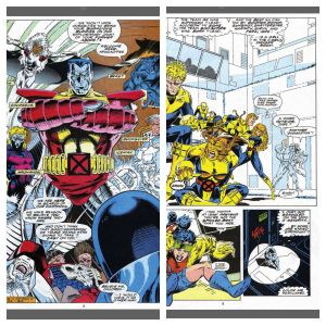 At the Xavier Mansion, X-Force are in detention cells, mocked up by the Danger Room (the X-Men’s equivalent of a holo-deck), dressed in official X-Men uniforms and being harangued by Jubilee before she is pulled away by Guido ‘Strong Guy’ Carosella. In the Danger Room control area, Polaris and Havok talk about how they’re the age they were when they started and have had a much harder road. In the infirmary, Psylocke considers a mercy killing on Xavier and he clings desperately to life.