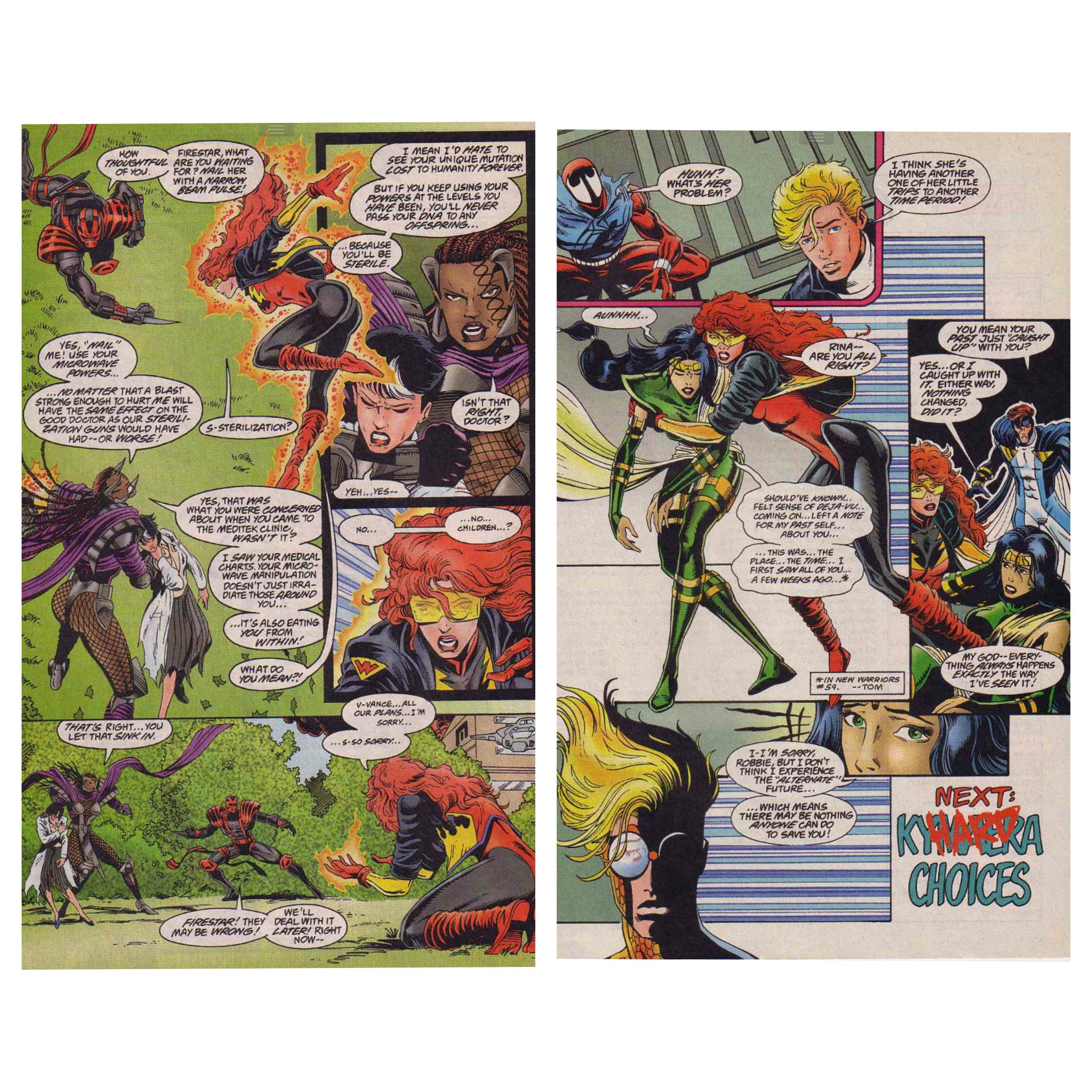 Plot: After their arrival at the end of the last issue, Psionex (now led by Night Thrasher & Rage) law into Eugenix. Very soon after, the New Warriors arrive in answer to Firestar’s emergency call. They see Psionex (a group they’ve battled before) and assume they are the problem and start on them, leaving Eugenix unchallenged for the most part.