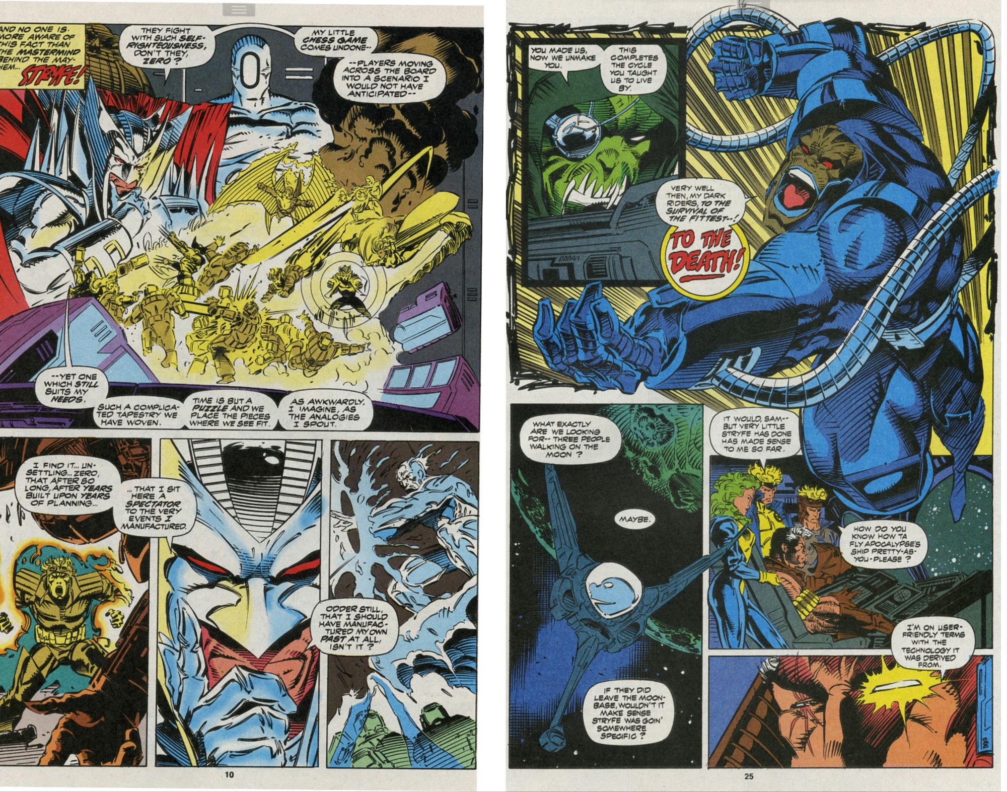 Stryfe sees that his army is failing him, but confident in the outcome, takes Scott ‘Cyclops’ Summers and Jean Grey out into the moon’s surface. Back on Earth, in the Westchester home of Charles Xavier, Dr Henry ‘Beast’ McCoy is pleased that Charles is beginning to heal from his recent ordeal. For a brief moment Charles wakes up and talks about the connections between Cable, Stryfe, Apocalypse, Scott, Jean and Sinister. He points out that there links are love, hate and blood.