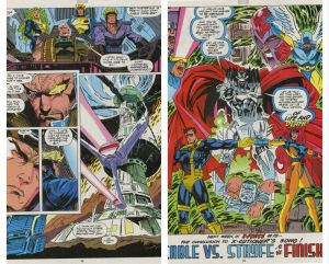 Plot: At Stryfe’s base, Bishop, Wolverine and Cable arrive and are immediately involved in a firefight with the Dark Riders and the rest of Stryfe’s soldiers. Cable tries to out gun everyone, Bishop is more disciplined in his response, while Wolverine leaps into the fray claws out. Bishop thinks Wolverine has gone berserk, but he’s just not being chatty. As the tide turns against them, Apocalypse and the X-Men (Storm, Havok, Psylocke, Polaris, Iceman, Cannonball and Archangel) burst in, all dramatic poses and declamation. Elsewhere, Stryfe waits, watching all of this revelling in his plans coming to fruition.