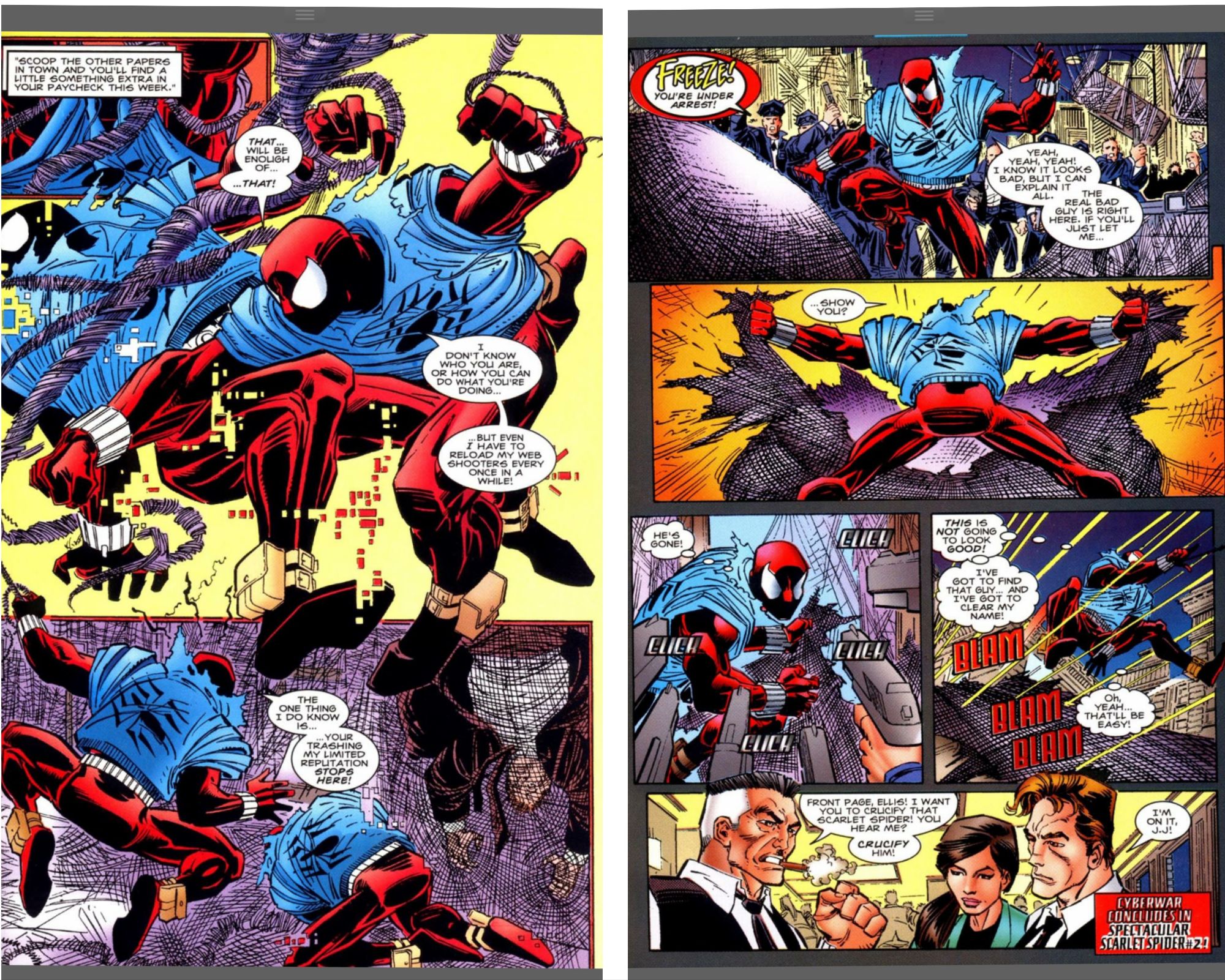 At the Daily Bugle, the faux Scarlet Spider attacks the front of the building as he wades through the police who are trying to stop him. He starts pulling the newspaper’s building down around them until the real Scarlet Spider arrives and they battle. Faux Scarlet Spider generates a gun from nowhere along with his seemingly limitless amounts of webbing. Realising how badly it’s going, Ben fires all of his stingers and impact webbing cartridges and leaves his opponent in a huge web sack. As the police arrive, Ben tears the bag open, but the faux Scarlet Spider is gone and now everyone things that everything he did, Ben did and now he’s on the run, with the Daily Bugle staff ready to crucify him in the press.
