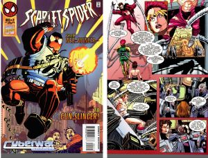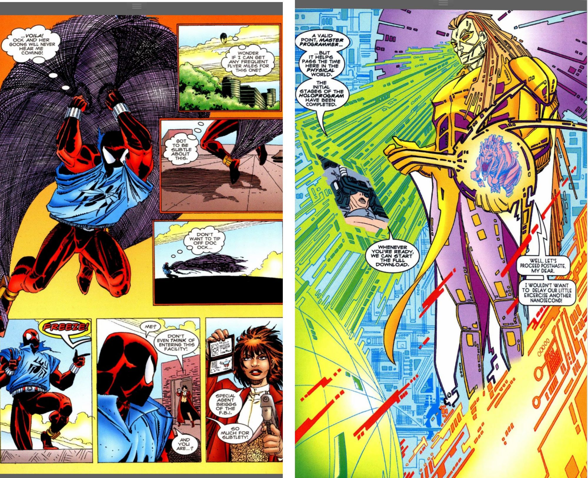 Far above that base, Ben Reilly in his Scarlet Spider outfit (given this location by Seward who is still trapped in Cyberspace) drops from a plane and floats down to the roof using a web-parachute, but is stopped at the roof access by Agent Briggs, Joe’s partner. She demands that Ben stay out of this Inside, Joe is behind fed all kinds of information gathered about the Scarlet Spider by Doc Ock II’s partner now revealed as the holographic entity calling himself the Master Programmer. The pair now generate a solid enough hologram of the Scarlet Spider, somehow linked to Joe Wade, who bursts out of the building, almost killing Briggs, who is saved by Ben as this psuedo-Scarlet Spider runs off on a mission from Doctor Octopus II, to ruin the original’s reputation.