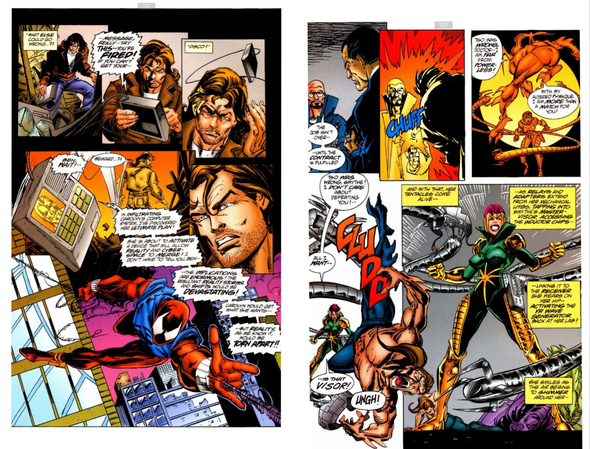 Doctor Octopus II and her goons attack the Darnell Building and wage war on the Cyber Slayers to get the necessary chips that both factions have been fighting over all along. Mid-fight, Tso (elsewhere in the building) co-opts Smythe’s control of the Cyber Slayers and leaves him at the mercy of Doc Ock II. As he gloats, he is killed by the Pro. Doc Ock II gets Smythe’s visor and uses the vital component to activate the VR Wave Generator back at her lab and this fuses local space with Cyberspace, Monsters and dinosaurs of all kinds walk into the regular world, putting the regular people near the Darnell Building at risk, but all Carolyn (Doc Ock II) can see is her love, the Master Programmer now made manifest in the world alongside her. Ben saves a child (who calls him Spider-Man) and Seward, fresh from his digital self also manifesting points out that if Ben puts another chip in Doc Ock II’s gear, this can all be undone. Ben takes this two the two reunited lovers and separates them, attacking the Master Programmer as a feint to draw Carolyn in. It works and he attaches the new chip to the Octopus harness and all of the VR creatures, including Seward and the Master Programmer disolve. Very soon afterwards, there’s nothing left. The Cyber Slayers are wrecked, Carolyn’s surviving goons are gone and Doctor Octopus II herself has disappeared as well, leaving only Ben standing;. So that’s when everyone arrives and Ben has to run.