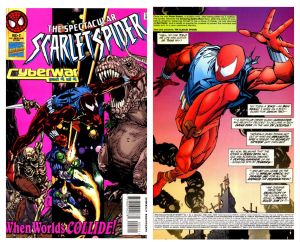Plot: Ben Reilly as the Scarlet Spider, is running for his life from an angry mob and the NYPD. The crowd want him dead and the police left their due process and warning shots in their other pants this morning. The doppelganger has done his job well and now disappeared. At the Darnell Building, Alistaire Smythe is showing off his Cyber Slayers to Mr Tso, who is now very angry with Ben’s continued absence, so he fires him as his bodyguard over voicemail. Smythe shows Tso that his new visor allows him to control multiple Slayers at once and as Tso’s other bodyguard leaves, the Pro, who has a contract on Tso to fulfil watches, and bides his time. At Doctor Octopus II’s base, she is ranting over the loss of the chips again, only now we learn what her overall plan is, it’s to merge the Virtual Reality with the regular kind, freeing the Master Programmer from his cyber-prison and allow him to walk in the regular world. The programmer is on board, but has to deal with Seward Trainer first. Elsewhere in that building, Joe Wade is still trapped in the machine that generated the Faux-Scarlet Spider and trying to comfort him is the real person behind Stunner, who we now learn is called Angelina Bracale. Linette Martinez watches from another room and orders more drugs to reduce his resistance.