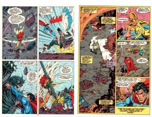 Notes: This is the first time you can see the panel reduction page design that often defines this story. Every page has 4 panels. Part 5 will have 3 panels etc. This has the effect of drawing you in more and more, ratcheting up the tension. As the battle moves across the country, Metropolis looks on, dreading the monster hitting their city. But ultimately it’s setting the idea that this whole massive story is getting Superman and Doomsday together one on one.