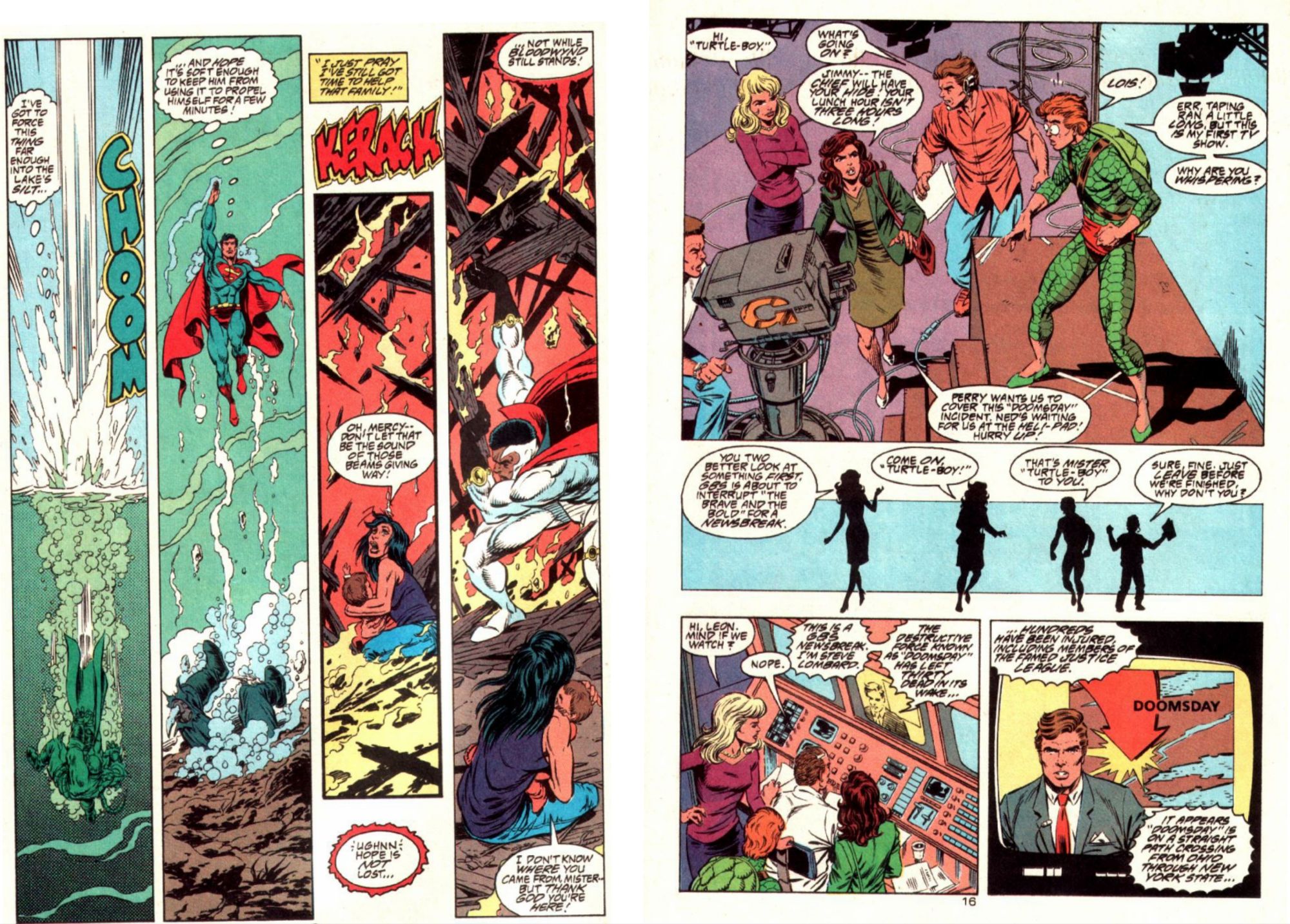 In Metropolise, Supergirl (the shapeshifting Matrix version) is watching Doomsday’s rampage on TV, while sitting on the lap of her boyfriend Lex Luthor II (actually the original brain of Lex Luthor in a cloned body, no seriously, that was the situation there) who convinces her to stay local, just in case the monster heads their way. At WGBS, Lois Lane drags Jimmy Olsen from his TV filming (the Turtle Boy show) with the permission of his boss Cat Grant.