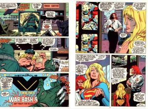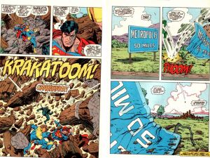 Doomsday arrives at LexMart and sees a TV promo for professional wrestling that mentions the city of Metropolis, the creature for the first time speaks, repeating that word. Superman flies in and takes the fight outside and sees that news choppers have arrived, including one with Lois and Jimmy on. In Metropolis, Lex Luthor II is watching the devastation on TV along with his girlfriend Supergirl, whom he convinces to stay there as the city gets tense without it’s hero and wants her to help keep the peace. His thought balloons help remind the audience that this Australian ‘son’ of Superman’s most ardent foe is in actuality Lex Luthor I in a cloned body, posing as his own son. (Damn I loved the 90s) The fight isn’t going well, Doomsday’s only sound is laughter until he sees a “60 miles from Metropolis” sign and speaks the word ‘Metropolis’ again. Superman is more determined than ever to stop this monster as now a bigger city (his home) is at risk. He throws the monster into a mountain, the one over the Cadmus Project.