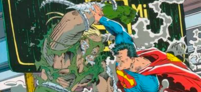 The fight goes through more and more of the area until it stops at Habitat, a city made of tree based sculptures, created by Cadmus. As the fight goes on more and more of Doomsday’s green apparel is torn showing him as a grey skinned monster with bony protrusions at it’s joints, knees, jaw, eyebrows and knuckles. Their fight pretty much destroys Habitat, burying Superman and an arriving Guardian (making sense, since he was created by Cadmus and acts as a security chief), but not Doomsday who is now 10 miles closer to Metropolis.