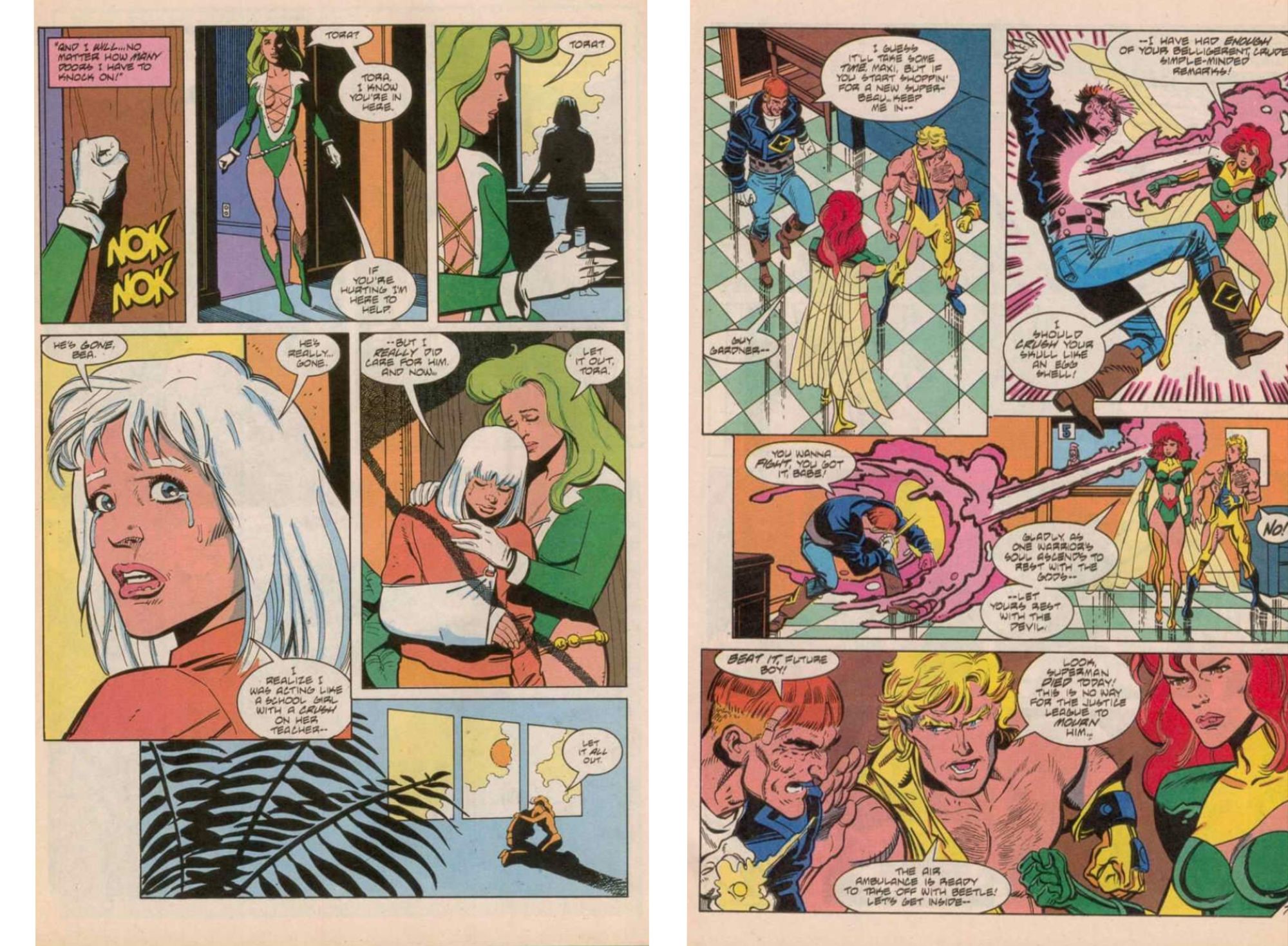 We get to see how the team are coping in the aftermath of Superman’s death at the hands of Doomsday and they aren’t. Maxima wants to move forward, Guy wants to show how it doesn’t bother him, Fire wants to comfort Ice and Booster feels awash in failure. Only Bloodwynd (hahahahaha) is left out of this sorrow, mostly to reinforce his man of mystery thing. But there aren’t many moments that land for me, except the last one. Booster, near tears at Ted’s bedside is the only actual emotional point for me. The memorial is just a box ticking exercise, Guy is doing that whole gruff macho crap and Ice’s crush on her boss doesn’t translate for me as pathos. I added this issue for completeness’ sake and kind wish I didn’t.