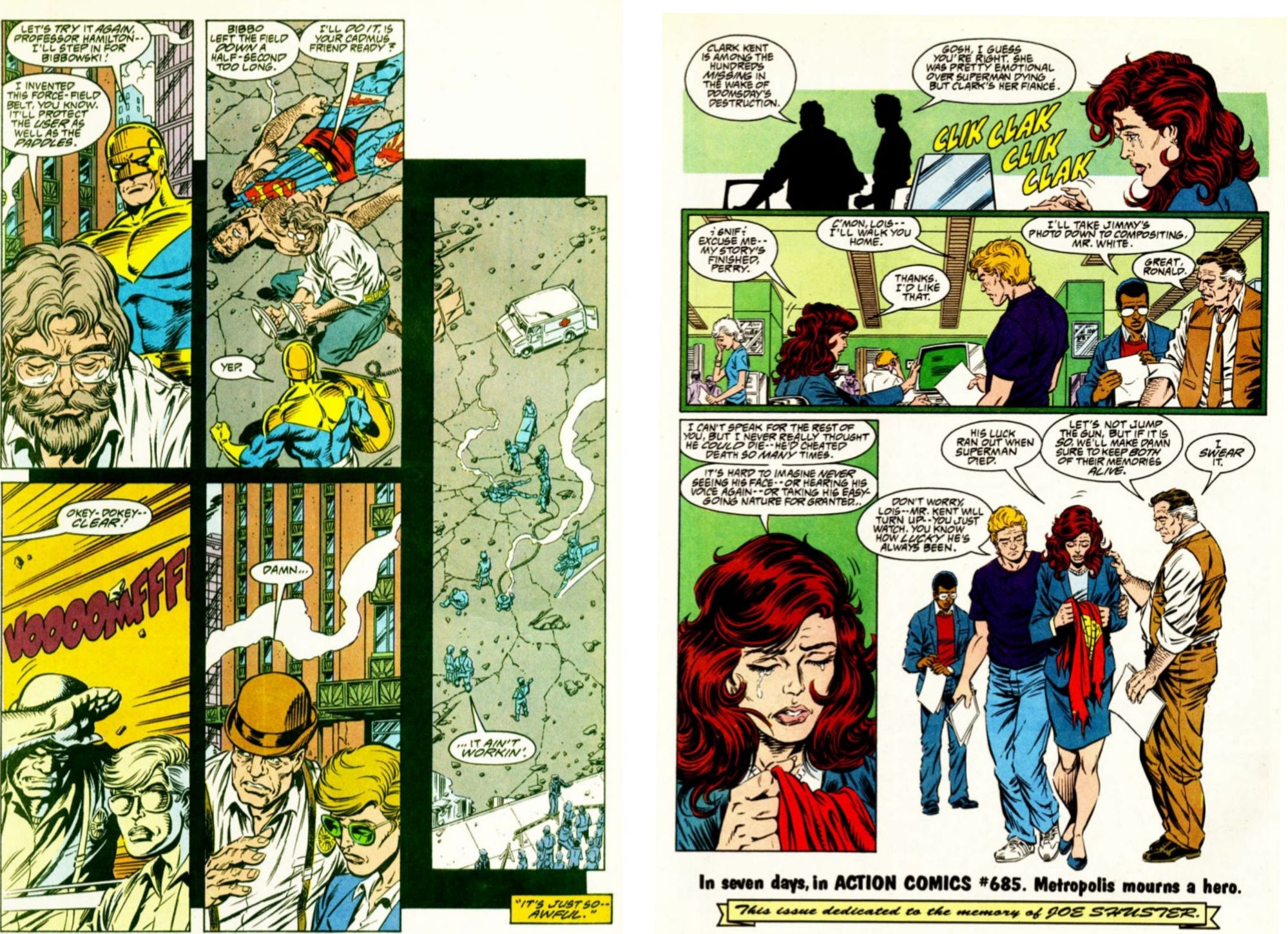 Plot: He’s dead. Bloodwynd and Ice have their moment from Justice League America 70 and vanish from the rest of the issue. Members of Cadmus and the Metropolis Special Crimes Unit as well as local paramedics arrive to try and resuscitate Superman and deal with the dead body of Doomsday. Guardian tries first, but can’t lift Superman’s chest with his breath. They have to go straight to defibrillators. Problem is, he’s too tough for them to do anything either. Nearby Dan ‘Terrible’ Turpin finds the beaten body of Supergirl, who has reverted to her Matrix form. He’s interrupted by Lex Luthor II, who covers her in his jacket and scoops her up to take her home. Everyone’s becoming a little desperate as no one really understands Superman’s physiology. Cat Grant mentions to Jimmy Olsen that they should call Clark up, horrifying Lois, who knows Superman is Clark and that his mum and dad may have watched it all on TV. Also watching on TV is Jose Delgado, babysitting Cat’s son Adam who doesn’t care that the city’s hero has just died. Jose yells at the kid who runs off and he looks at his old Gangbuster uniform (an identity that Superman has also used in the past) and wonders whether he is needed once more. In Kansas, Jon & Martha Kent turn the TV off, unable to watch more coverage of their son’s death.