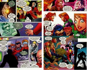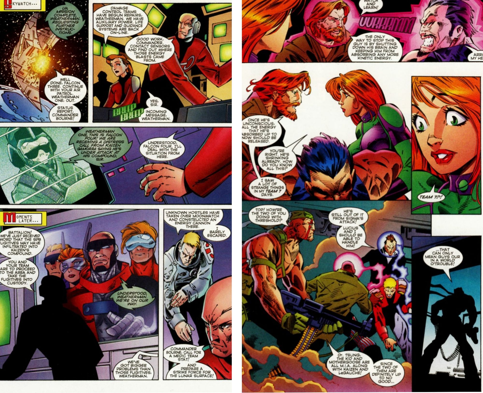 Above Gamorra, Lucius and his friend Alex Fairchild (I know it’s not stated, but it’s a little on the obvious side) are parachuting in, Alex cloaking the pair from Gamorran aircraft. Up in SkyWatch, Weatherman fields a report of the attack on Kaizens lab by Gen-13 and others and he contacts StormWatch and sends them in. As the team are dispatch, a survivor from the moonbase alerts him of the Sword’s attack. Weatherman calls for a medic and prepares a strike force.