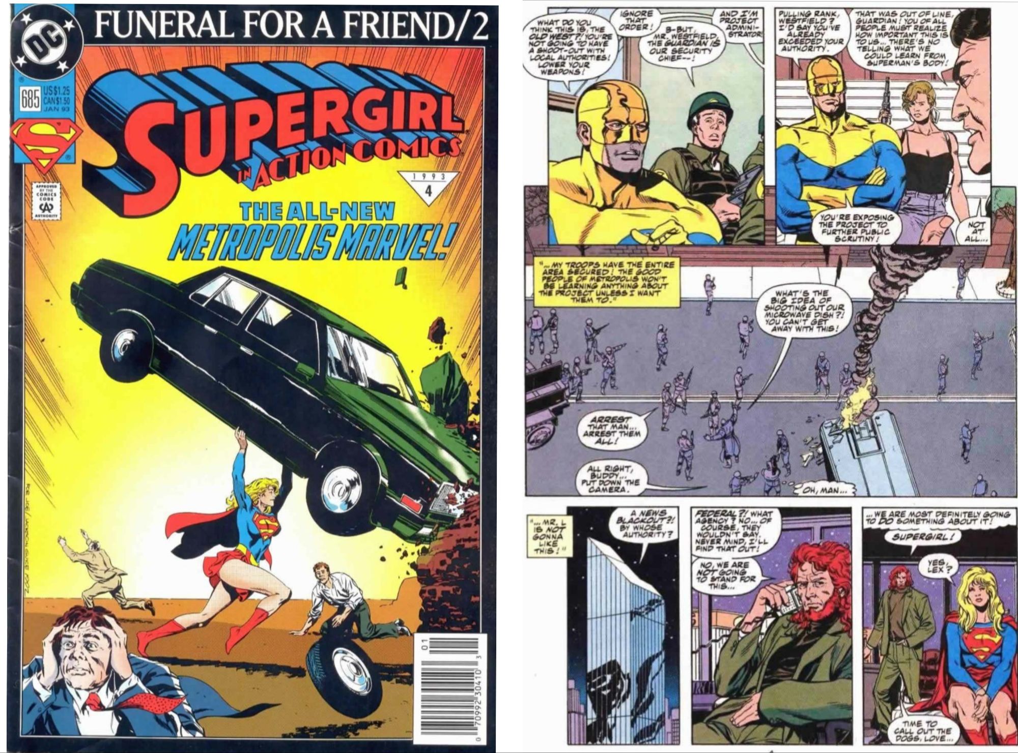 Plot: With the battle to save Superman’s life over, the battle to possess his body begins in earnest. Cadmus director Westfield starts throwing federal authority to claim the body of what is essentially an alien. When Lex Luthor II gets wind of it, he sends Team Luthor (his personal armoured security team) to keep the body in place while he speaks to his ‘father’s’ contacts. This has the effect of the White House declaring Superman is an American and not subject to Cadmus’ experiments. The Mayor (very much in Luthor’s pocket) agrees and declares that part of Centennial Park will be set aside as a memorial. Lex offers to fund it, declaring the intent to create a monument worthy of the hero.