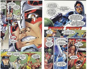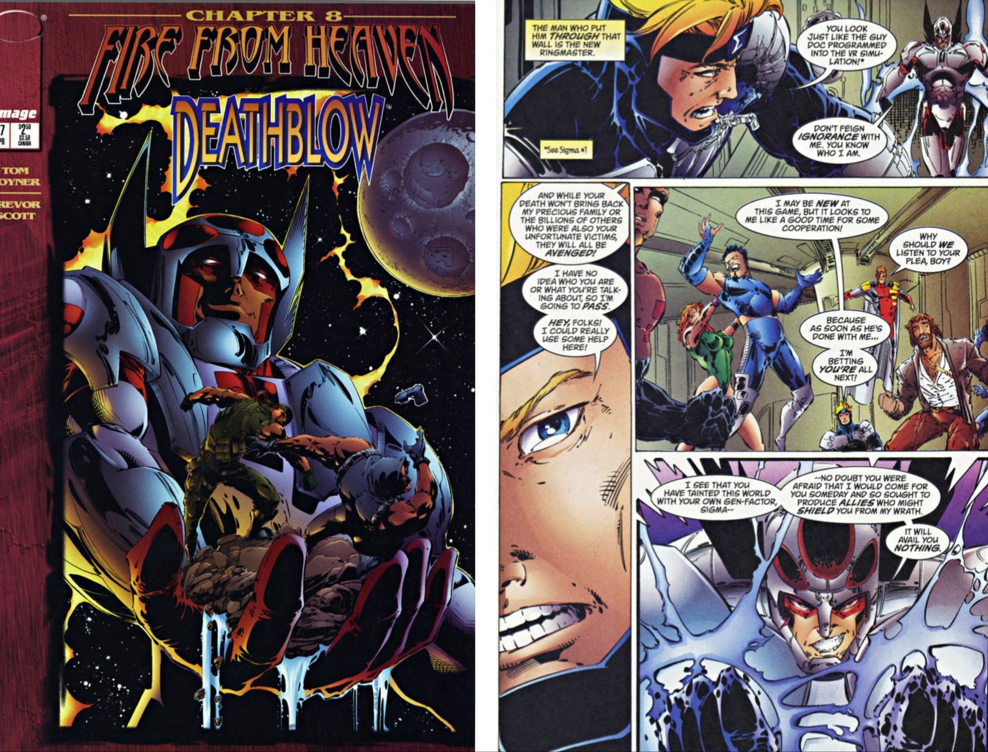 Plot: The battle at Kaizen’s lab reaches a crescendo, the battle between the survivors of Team-7 plus Gen-13 taking on DV8 is in full ferocity, but then brought into it is Damocles and his battle with Sigma. Damocles rails against Sigma. His attack is personal and Damocles mentions his lost family and his blame for that loss aimed squarely at Sigma, who has no idea at all what he is talking about. Simon seems to know who Damocles is (in the past using Damocles’ image for Ethan’s training) and tells all involved that Damocles is the reason for his lost family, not Sigma. Damocles turns to see who dares speak that way and is horrified once he sees Tsung, seemingly recognising him, but is unnerved by this. Meanwhile Ivanna sees that this fight isn’t really benefiting her side (meaning her) and gets Threshold and DV8 to leave, despite the DV8 members’ objections. As they leave, Deathblow catches up with LeGauche who admits to killing his parents, it then becomes some weird philosophical conversation on the tenets of free-will, patriotism and belief in something. LeGauche makes the point that they’re both killers and Deathblow dresses it up in window dressing and the fact that he believes in what he is doing is a weakness. Deathblow points out that he’s killed because he had to, rather than the love of it and he did it to protect people from people like LeGauche and Craven and that’s the last thing he says before stabbing LeGauche in the chest and following it up with a bullet to the brain.
