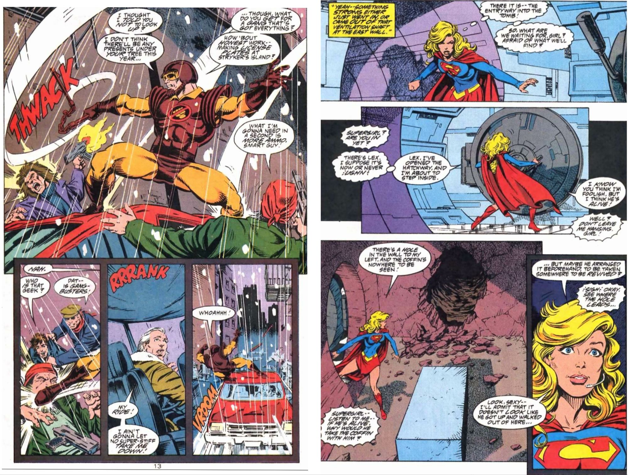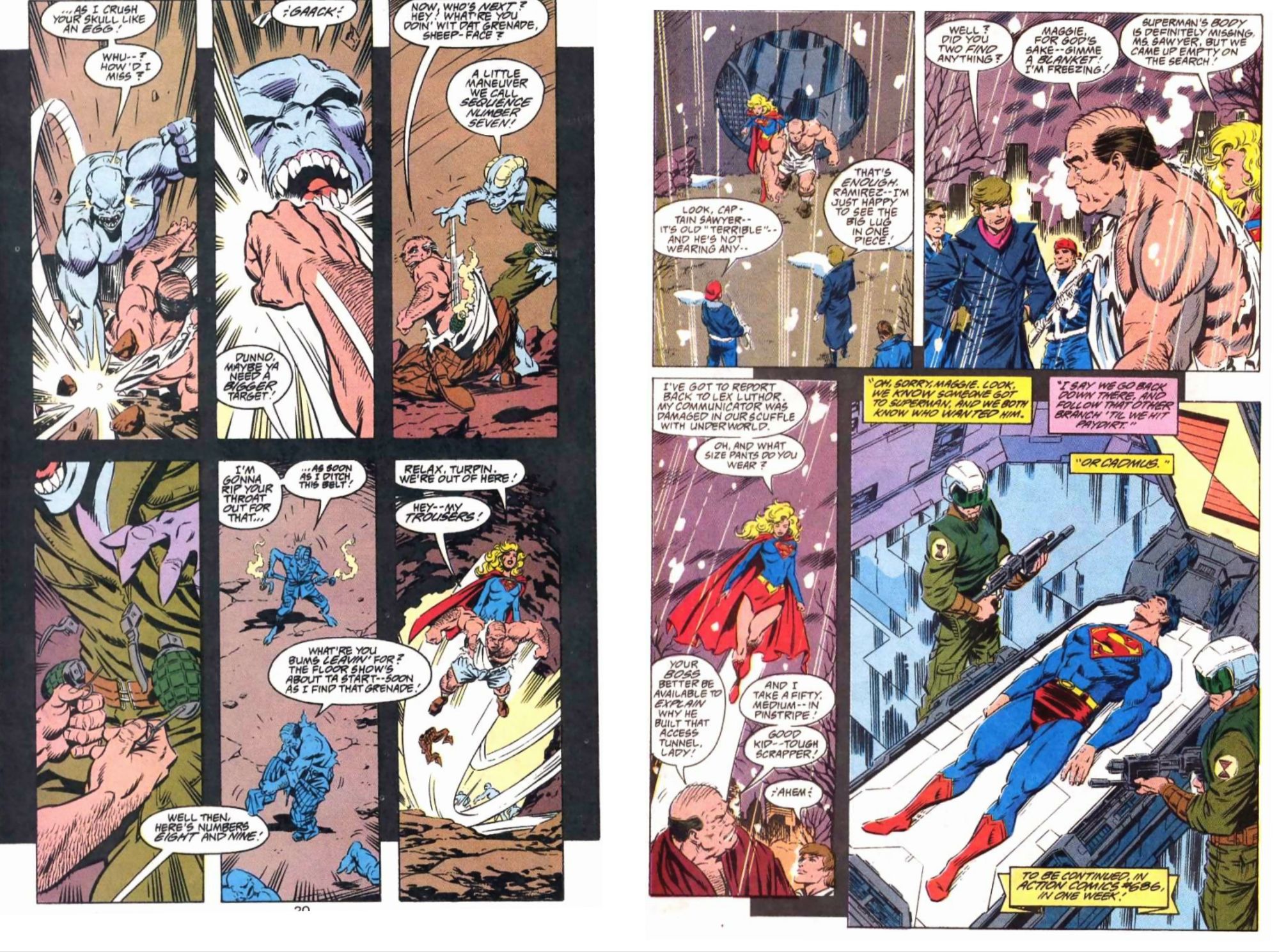 Back at the statue, Dan Turpin has arrived and follows where the undercover guy told him Supergirl went, he asks for his superior officer Maggie Sawyer be summoned. Later that evening, Bibbo is heading home from a night at his bar when he interrupts a drug deal and finds himself outnumbered 4 to one. He’d be doomed, except the arrival of Gangbuster, who makes short work of the 4. Meanwhile Supergirl has arrived at the caverns under the streets of Metropolis and comes across the underworlders, including the huge Clawster. Turpin arrives shortly after and is also set upon by the creatures there. One of them, a large light blue creature tries to beat this heavy set older man up and finds that he’s called terrible for a good reason and receives a savage beating. Then he sets off some grenades that were meant for him by the creatures. Beaten and with torn clothes Turpin is flown out by Supergirl and returned to the growing police presence in the park. Turpin reports to Maggie Sawyer about what happened and thanks Supergirl for the rescue, as well as telling her that Lex owes him a suit and the police an explanation why there was a maintenance tunnel to the tomb in the first case.