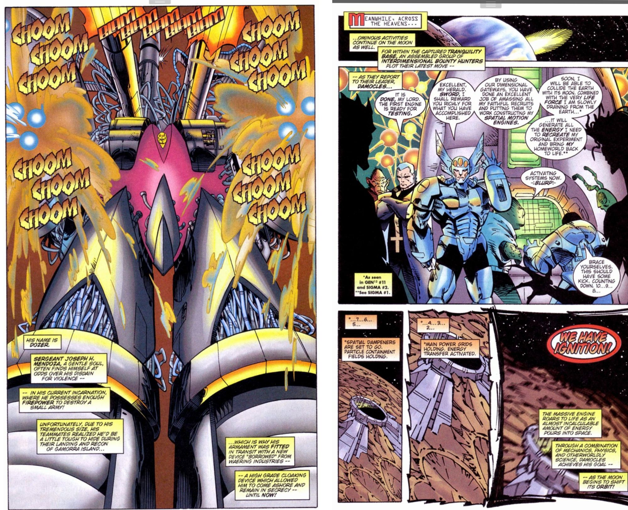 At a village on the way to the capital, this rebel alliance sees the fear in the eyes of the oppression people of Gamorra and are almost immediately attacked by Attack Drones who start firing indiscriminately. They are soon outgunned and it doesn’t look good, but Mother has already called in backup, the final member of Wetworks, the immense Sgt Joseph H Mendoza, known simply as Dozer who at this point is dozens of feet tall and possesses enough firepower to turn the odds against the Drones. This battle decimates the Drones, but also the village and the damage can be seen and heard from Kaizen Gamorra’s home. Kaizen is angry and considers StormWatch unable to be of help, but is surprised when the mercenary Deathtrap arrives to take over the situation and save Gamorra from this rebellion. On the moon Damocles is informed by his Sword that the engine is ready and it will launch the moon at the Earth, destroying both and providing Damocles with the energy to recreate his original experiment and restore his home-world. The engine is started and the effects are soon felt as in the pacific ocean, the change in tides causes a tidal wave hundreds of feet high to engulf an american aircraft carrier, with all hands on board.