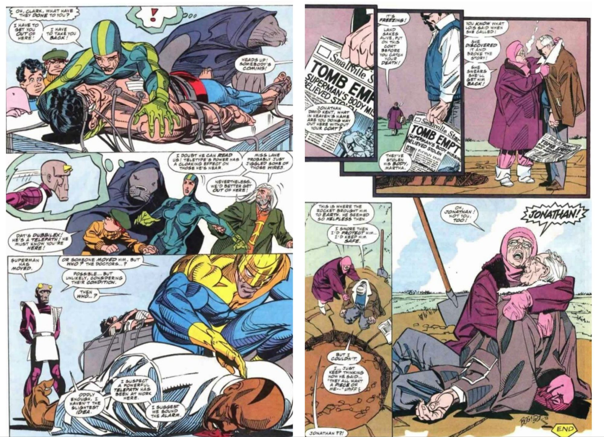 In Cadmus, Dubbilex and Guardian are with the corpse of Superman until the Newsboy Legion arrive. (Side-note, like Guardian they are clones of the original 1940s Newsboys) They question why they have Superman’s body. Now we go back to Kansas and Jonathan is remembering his son again, this time younger and he’s laughing to himself in a melancholy remembrance.