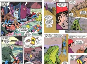 Later on at the statue of Superman, Lois gets past the crowd of Superman worshippers to get to the tomb, only to find Maggie Sawyer there. Recognising that Lane won’t go anywhere without answers, she fills her in on the events of the last couple of issues, including the theft of her fiance’s body. She’s looking despondent when Charlie waves her down from the river with a frog-like underworlder. Charlie shows her the detonator, proof that Cadmus was involved in the flood and the theft of Clark’s body.