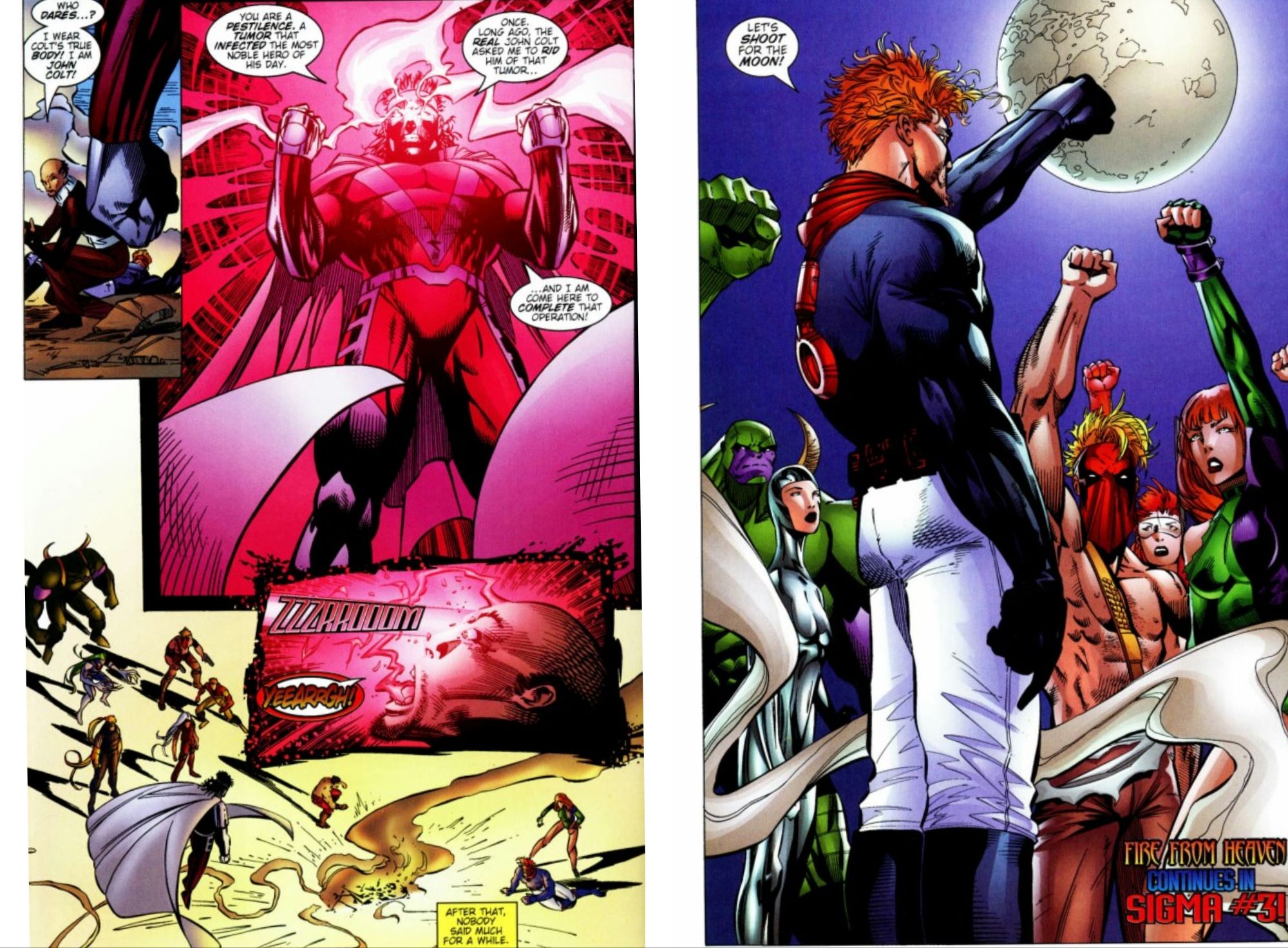 The fight gets more savage, but is ended by Mr Majestic finishing the fight by vapourising Gamorra. Now with Gamorra dead, the threat on the moon becomes the more pressing issue. The heroes are demoralised and exhausted, but Spartan walks up and gives them a stirring speech and tells them they can shoot for the moon. Seriously he actually says that.