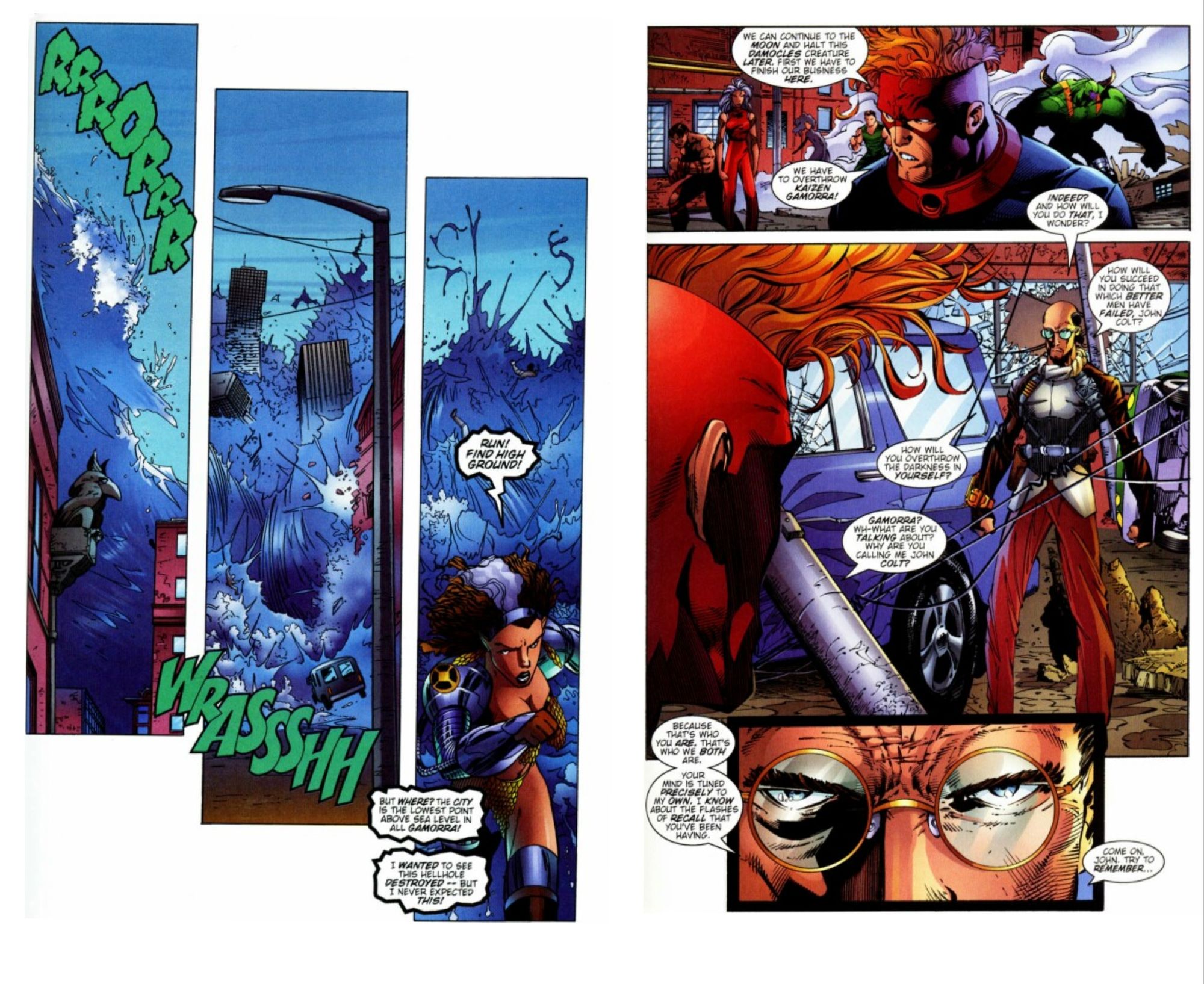 Kaizen faces Spartan and challenges him to remember. Hadrian has more flashes and remembers his like. He remembers being Yon Kohl, a Kherbium like Zealot and Mr Majestic. He remembers being the 1930’s adventurer John Colt, until something went wrong and John was killed by Mr Majestic at John’s own request. Lord Emp (Jacob Marlowe, the founder of WildC.A.T.S. and the creator of the Hadrian/Spartan robot) had John Colt’s personality/mind placed into the first Hadrian’s body. He took the name Spartan, because he was the model for the Spartan Guards on Khera. With his whole life now accessible to him, he wonders how Kaizen knows this. Then Kaizen reveals that he replaced the original Kaizen Gamorra and is actually the original John Colt. The two then battle one another, the original John Colt left for dead and bitter against the mind of John Colt in this mechanical body who was more in line with what Colt stood for.
