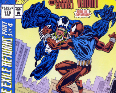The Exile Returns - Part 3 Echoes of Silence Credits: Terry Kavanaugh words, Steven Butler and Randy Emberlin on art and edited by Eric Fein. Cast: Ben 'Scarlet Spider' Reilly, Ken Ellis, Gabrielle Greer, Eddie Brock/Venom and unnamed Symbiote creature. Plot: Echoes of Silence opens with an injured Ben Reilly (still in his Scarlet Spider outfit) managing to … Continue reading Web of Spider-Man 119: Well at least he found a use for the sleeves.